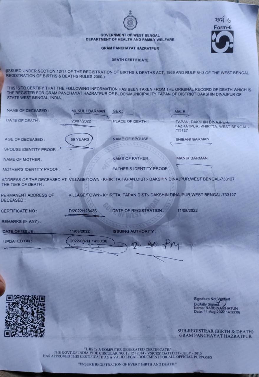 যদিও হজরতপুর গ্রাম পঞ্চায়েতের প্রধান রাব্বিনা বিবির দাবি, আবেদন অনুযায়ী তারা মৃত্যুর শংসাপত্র প্রদান করেছিলেন। এর বাইরে আর কিছুই জানা নেই তার।