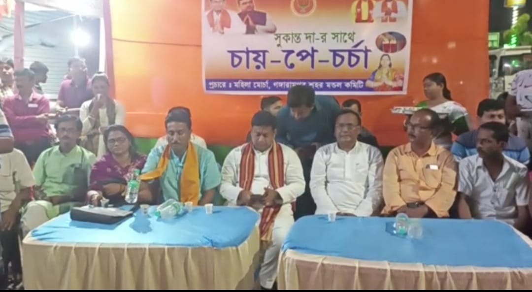 গঙ্গারামপুর ১১মে দক্ষিণ দিনাজপুর : ——-—-চায়ে পে চচায় যোগদান করলেন জেলার সাংসদ তথা রাজ্যে বিজেপির সভাপতি।বৃহস্পতিবার রাতে দক্ষিণ দিনাজপুর জেলার গঙ্গারামপুর বিজেপির টাউন মহিলা মোচার মন্ডল কমিটির উদ্যাগে গঙ্গারামপুর হাইরোডে জেলার সাংসদ তথা বিজেপির রাজ্যে সভাপতি ডক্টর সুকান্ত মজুমদার হাজির হয়েছিলেন। তিনি একটি পথ সভাও করেন গঙ্গারামপুর চৌপতিতে। সেখানে জেলা বিজেপির সাংসদ ছাড়াও বিজেপির জেলা সভাপতি সরূপ চৌধুরী বিজেপির বিধায়ক সত্যেন্দ্রনাথ রায়, বিজেপির টাউন মন্ডল সভাপতি বৃন্দাবন ঘোষ, বিজেপির জেলা নেতা অশোক বর্ধন, প্রদীপ সরকার সহ আরো অনেকেই উপস্থিত ছিলেন। জেলার সাংসদ তথা বিজেপির রাজ্যে সভাপতি থেকে শুরু করে উপস্থিত বিজেপি নেতারা সকলেই রাজ্যে তৃণমুল সরকারের কড়া সমলোচনা করেন। বৃহস্পতিবার রাতে গঙ্গারামপুর হাইরোড়ে গঙ্গারামপুর বিজেপির টাউন মহিলা মোচার মন্ডল কমিটির উদ্যাগে চায়ে পে চচায় যোগদান করলেন জেলার সাংসদ তথা রাজ্যে বিজেপির সভাপতি ডক্টর সুকান্ত মজুমদার।সেখানে তিনি চায়েপে চচা অনুষ্ঠানে যোগদান করেন।পরে একটি সভাতে যোগদান করতে উঠে ডক্টর সুকান্ত মজুমদার চৌপথিতে একটি সভা করেন।