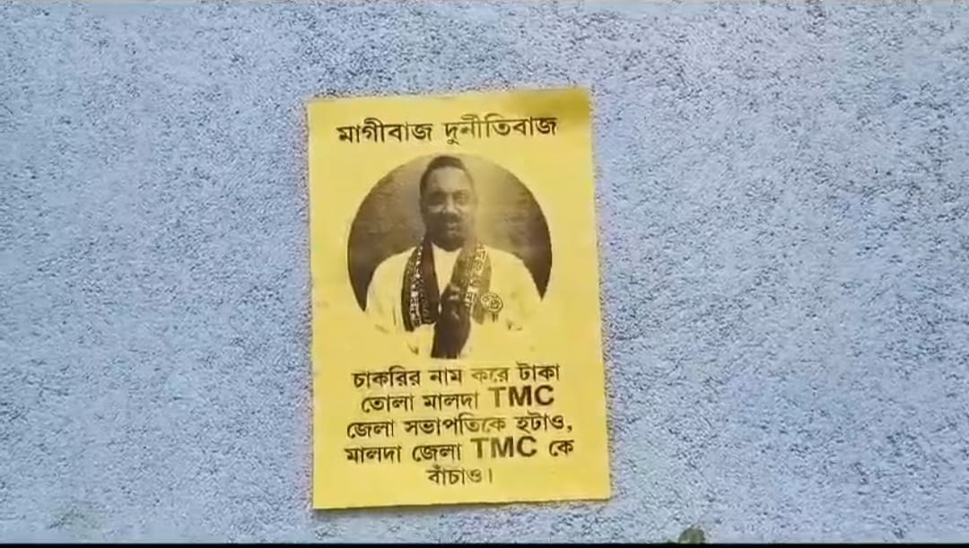 মালদা, চাঁচল, ৯ জুন : ——————————-—লোকসভা ভোটে মালদাই দুই কেন্দ্র ভোগাডুবি তৃণমূলের। এই খারাপ ফোলা ফলের জন্য জেলা চেয়ারম্যান ও জেলা সভাপতির ঘারে দায় চাপিয়েছে দলের নিচু তলার কর্মীরা। কয়েকদিন ধরে সোশ্যাল মিডিয়ায় জেলা সভাপতি ও জেলা চেয়ারম্যানের বিরুদ্ধে ক্ষোভ প্রকাশ করে পোস্ট করছেন দলের কর্মীরা। জেলার অন্যান্য শীর্ষ নেতৃত্বরাও মুখ খুলেতে ছাড়েননি জেলা চেয়ারম্যান ও সভাপতির বিরুদ্ধে। সোশ্যাল মিডিয়ার পোস্ট ঘিরে কয়েকদিন ধরে জেলার রাজনীতিতে শোরগোল পড়ে যায়। এর রেস কাটতে না কাটতেই জেলা সভাপতি আব্দুর রহিম বক্সির নিজস্ব বিধানসভা মালতিপুর তৃণমূল কার্যালয়ে দুর্নীতিবাজের পোস্টার পড়ল। শনিবার রাতে এই পোস্টার ঘিরে চাঞ্চল্য মালতিপুর এলাকায়। তবে সকাল হতেই সেই পোস্টার ছিঁড়ে ফেলেন জেলা সভাপতির অনুগামীরা। রবিবার সকালে সেই একই পোস্টার নজরে আসে মালতিপুর বিধানসভা এলাকার বিভিন্ন প্রান্তে। রবিবার সকালেও সেই পোস্টার ঘিরে শোরগোল পরে যায় মালতীপুর বিধানসভা এলাকাজুরে।