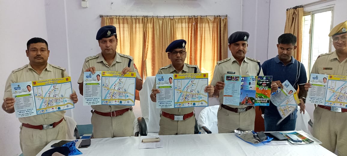 গঙ্গারামপুর, দক্ষিণ দিনাজপুর:- শহরের দূর্গা পূজা মন্ডপ গুলি পরিদর্শনে দর্শনার্থীরা যাতে নির্বিঘ্নে পূজোর আনন্দ উপভোগ করতে পারেন, যানজট মুক্ত ভাবে মন্ডপে মন্ডপে প্রতিমা দর্শন করতে পারে, তা নিশ্চিত করতেই এদিন গঙ্গারামপুর শহরের পুজো গাইড ম্যাপ প্রকাশ করল দক্ষিণ দিনাজপুর জেলা পুলিশ। এদিন গঙ্গারামপুর পুলিশ স্টেশনে একটি কর্মসূচির মধ্য দিয়ে পূজোর গাইড ম্যাপ প্রকাশ করেন অতিরিক্ত পুলিশ সুপার ইন্দ্রজিৎ সরকার। এছাড়াও হাজির ছিলেন মহাকুমা পুলিশ আধিকারিক দীপাঞ্জন ভট্টাচার্য, ট্রাফিক ডিএসপি বিল্লমঙ্গল সাহা, গঙ্গারামপুর থানার আইসি শান্তনু মিত্র, ট্রপিক ওসি রজত প্রধান সহ অন্যান্য পুলিশ কর্তারা।