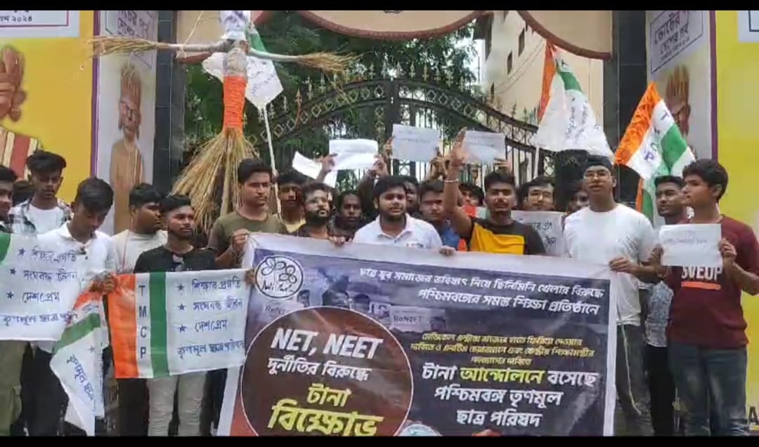 নিট এবং নেট পরীক্ষার দুর্নীতিতে সরব গোটা দেশ। রাজ্যের একাধিক জেলাতে এনিয়ে ক্ষোভ দেখা দিয়েছে। এবারে কেন্দ্রীয় শিক্ষা প্রতিমন্ত্রীর শহর থেকে লাগাতার আন্দোলনের ডাক দিল টিএমসিপি । শনিবার দুপুরে বালুরঘাট কলেজের সামনে বিক্ষোভ প্রদর্শন করে তৃণমূল ছাত্র পরিষদ। কেন্দ্রীয় শিক্ষামন্ত্রী ধর্মেন্দ্র প্রধানের কুশপুতুল দাহ করে ঘটনার প্রতিবাদ জানান আন্দোলনকারীরা । এদিনের কর্মসূচিতে উপস্থিত ছিলেন তৃণমূল ছাত্র পরিষদের জেলা সভাপতি অমরনাথ ঘোষ, শহর তৃণমূল ছাত্র পরিষদের যুগ্ম কনভেনর সুরজ সাহা ও সৌরভ সরকার সহ অন্যান্যরা। এদিন কলেজ গেটে বিক্ষোভের পাশাপাশি এই ঘটনার দায় কেন্দ্রীয় শিক্ষাপ্রতিমন্ত্রীর উপরও চাপিয়েছেন তৃণমূল ছাত্রপরিষদে নেতা কর্মীরা । ডাক্তারি পরীক্ষার দুর্নিতির সঠিক তদন্তের দাবীতে আগামী দিনে জেলার প্রতিটি কলেজে লাগাতার বিক্ষোভ কর্মসূচীর ডাক দেওয়া হয়েছে বলে জানিয়েছেন তৃণমূল ছাত্র পরিষদের জেলা সভাপতি অমরনাথ ঘোষ।