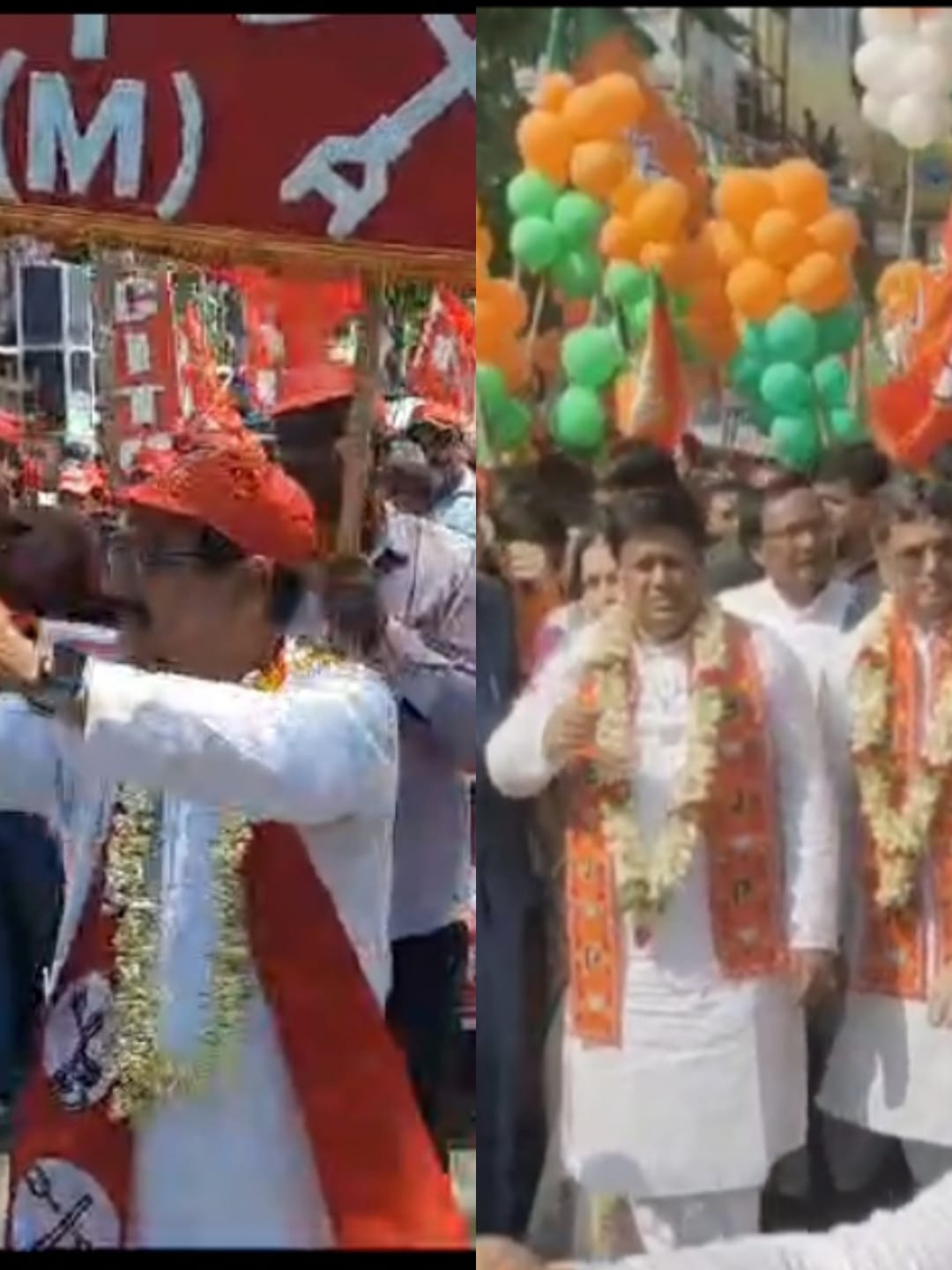 বালুরঘাট, ৩ এপ্রিল——– বাম বিজেপির নমিনেশন পর্বকে ঘিরে কার্যত অবরুদ্ধ বালুরঘাট শহর। বুধবার সকাল থেকেই যাকে ঘিরে আঁটোসাটো পুলিশি নিরাপত্তা ব্যবস্থা ছিল শহরজুড়ে। এদিন প্রথমেই শহরের যুবশ্রী মোড় এলাকা থেকে আর এসপি প্রার্থী জয়দেব সিদ্ধান্তকে নিয়ে একটি সুসজ্জিত মিছিল করে বাম নেতাকর্মীরা, জমা দেন মনোনয়নপত্রও। এরপরে বেলা বাড়ার সাথে সাথে বিজেপির সুসজ্জিত মিছিল কে ঘিরে কার্যত অবরুদ্ধ হয়ে যায় বালুরঘাট শহর। ত্রিপুরার মুখ্যমন্ত্রী মানিক সাহাকে সঙ্গে নিয়ে মিছিলের পুরো ভাগে থেকে শহরবাসীকে হাত নাড়িয়ে ও হাত জোড় করে মনোনয়ন দাখিল করতে যান বালুরঘাটের বিজেপি প্রার্থী তথা রাজ্য বিজেপির সভাপতি সুকান্ত মজুমদার। সুকান্তর সাথে এদিন পায়ে পা মিলিয়ে শহর পরিক্রমা করেন তার স্ত্রীও। তবে এই মনোনয়ন পর্বকে ঘিরে বাম ও বিজেপি কর্মী দের মধ্যে উচ্ছ্বাস যথেষ্টই চোখে পড়ার মতো ছিল। রেলউন্নয়ন কে হাতিয়ার করে বালুরঘাট কেন্দ্র থেকে নির্বাচন জয়ের স্বপ্ন সুকান্ত দেখলেও, বাম প্রার্থী জয়দেব সিদ্ধান্ত যুবক যুবতীদের কর্মসংস্থানের দাবিতে সোচ্চার হয়েছেন এই কেন্দ্রে।