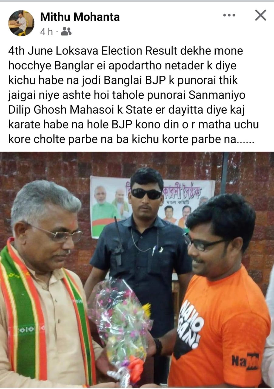 যদিও ওই বিজেপি নেতা মিঠু মহন্তর দাবি, দিলীপ ঘোষ রাজ্য বিজেপিকে শুন্য থেকে ১৮ তে নিয়ে এসেছে। কিন্তু বর্তমান নেতৃত্বদের অযোগ্যতায় তা ১২ তে গিয়ে দাঁড়িয়েছে। আর যে কারনেই তিনি এমন একটি পোস্ট করেছেন ফেসবুকে।