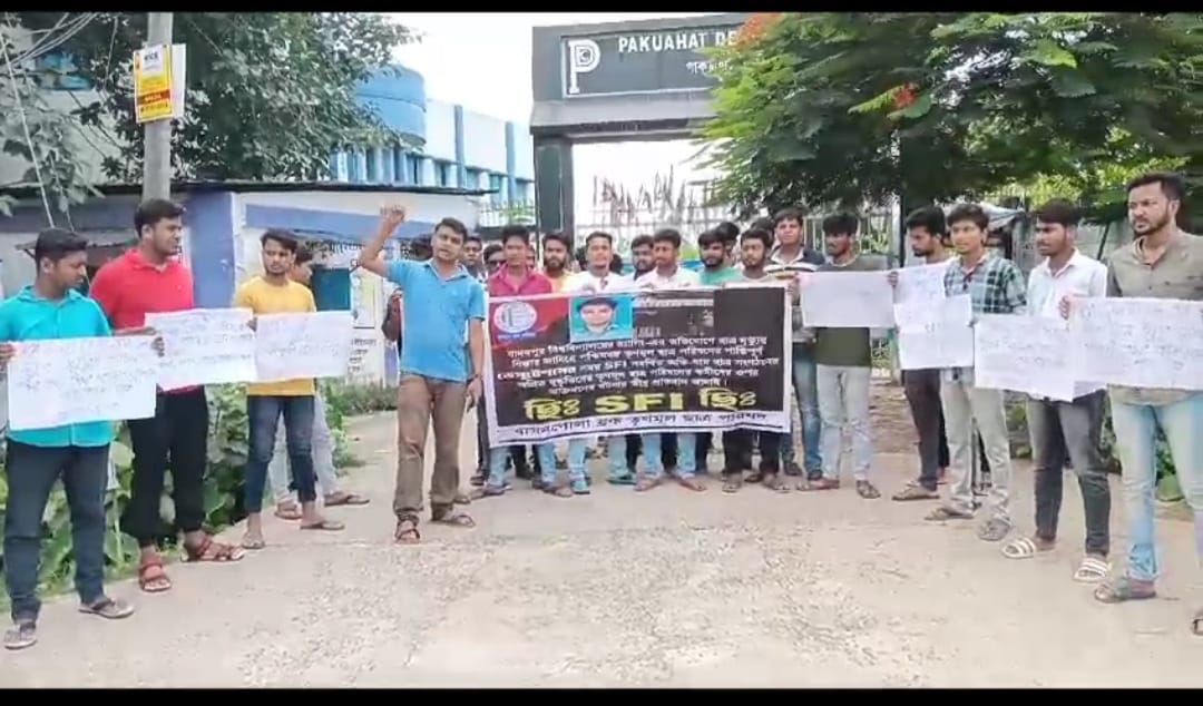বামনগোলা, মালদা:———-– সম্প্রতি যাদবপুর বিশ্ববিদ্যালয়ের রেগিং এর অভিযোগে ছাত্র-মৃত্যুতে তোলপাড় রাজ্য জুড়ে। সেই পরিপ্রেক্ষিতে যাদবপুর বিশ্ববিদ্যালয়ের রেগিং এর ছাত্র মৃত্যুর প্রতিবাদে তৃণমূল ছাত্র পরিষদের ডেপুটেশন এর সময় এস.এফ আই বাম ছাত্র সংগঠনের দ্বারা তৃণমূল ছাত্র পরিষদের কর্মীদের উপর আক্রমণের প্রতিবাদ জানিয়ে, বৃহস্পতিবার বামনগোলা ব্লক তৃণমূল ছাত্র পরিষদের পক্ষ থেকে পাকুয়াহাট ডিগ্রী কলেজের সামনে বিক্ষোভ সমাবেশ করে তৃণমূল ছাত্র পরিষদের কর্মীরা। এদিন পাকুয়াহাট ডিগ্রী কলেজের সামনে হাতে ব্যানার, প্লে কার্ড নিয়ে বাম ছাত্র সংগঠনেকে তীব্র ধিক্কার জানিয়ে বিক্ষোভ পরিদর্শন করেন তৃণমূল ছাত্র পরিষদের কর্মীরা। এদিনই সমাবেশে উপস্থিত ছিলেন তৃণমূল ছাত্র পরিষদের ব্লক সভাপতি টোটন দাস, সহ তৃনমূল ছাত্র পরিষদের অনন্যা কর্মীরা।