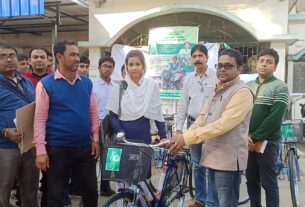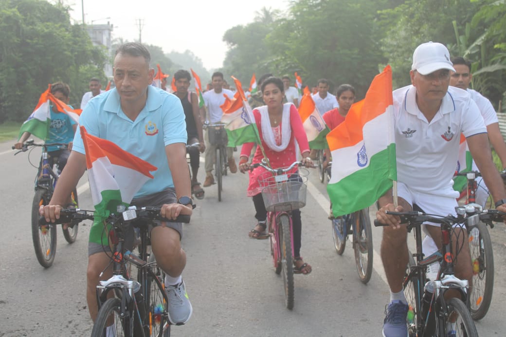 বালুরঘাট, ১৪ আগষ্ট —-—- হর ঘর তিরাঙ্গা কর্মসূচীকে ঘিরে সীমান্তে জাতীয় পতাকা নিয়ে সাইকেল র‍্যালি বিএসএফের। বুধবার সকালে ৬১ নং বিএসএফ ব্যাটেলিয়নের উদ্যোগে আয়োজিত হয় এই সাইকেল র‍্যালিটি। যে র‍্যালিতে এদিন অংশগ্রহণ করতে দেখা যায় সীমান্ত এলাকার ছেলে মেয়েদেরও। মূলত স্বাধীনতা দিবসের প্রাক মুহুর্তে প্রত্যেক দেশবাসীর উদ্দেশ্যে জাতীয় পতাকা নিয়ে বিশেষ ম্যাসেজ পৌছাতেই এই সাইকেল র‍্যালির আয়োজন বলে জানানো হয়েছে বিএসএফের তরফে। এদিন সকালে দক্ষিণ দিনাজপুরের বাংলাদেশ সীমান্ত লাগোয়া হিলির ওয়ার মেমোরিয়াল থেকে শুরু হয় সাইকেল র‍্যালিটির যাত্রাপথ। ৫১২নং জাতীয় সড়ক ধরে প্রায় চৌদ্দ কিলোমিটার জনবহুল বিভিন্ন এলাকা পরিক্রমা করে অবশেষে ত্রিমোহিনীতে এসে শেষ হয় সাইকেল র‍্যালিটি। বিএসএফ সূত্রে জানা গেছে হর ঘর তিরাঙ্গা কর্মসূচী সফল করতেই এই বিশেষ র‍্যালির আয়োজন এদিন।